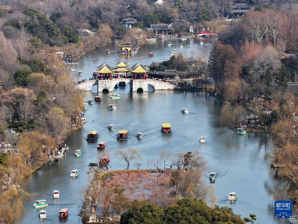 2月17日,江苏扬州瘦西湖风景区游人如织(无人机照片)。