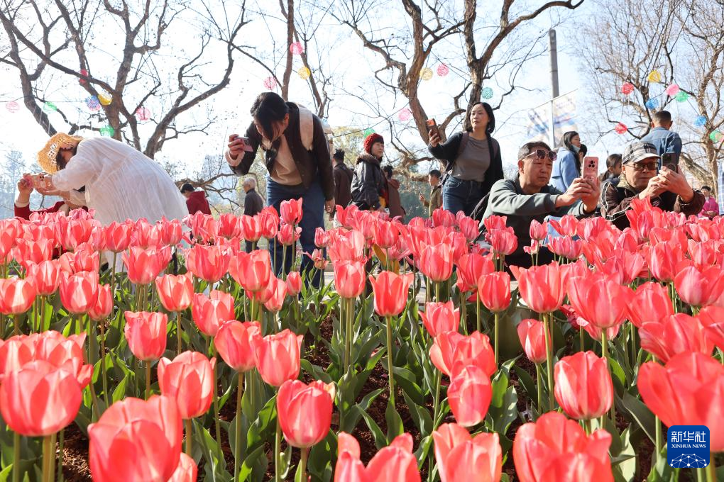2月17日,游客在云南省昆明市翠湖公园观赏郁金香。