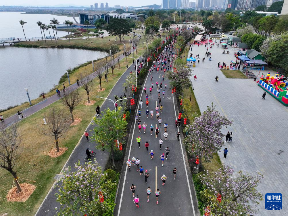 2月17日,人们在广西梧州市龙圩区龙圩镇参加新春欢乐环湖跑(无人机照片)。