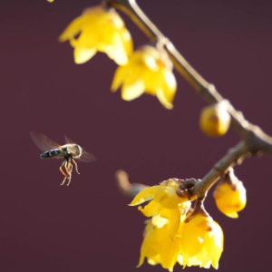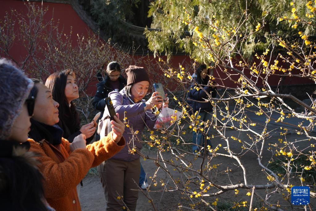 近日,北京卧佛寺内蜡梅花盛开,引蜂花间采蜜。许多游客前来打卡拍照。