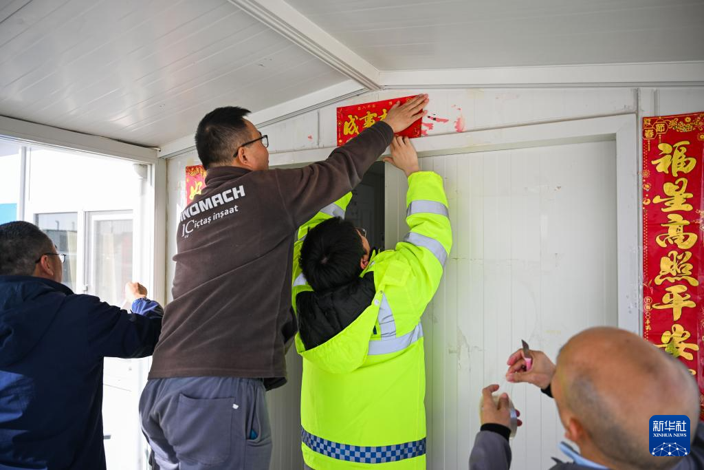 2月16日,在土耳其阿克萨拉伊省图兹湖地下天然气储库扩建项目二期工程营地,中工国际的职工在贴春联。