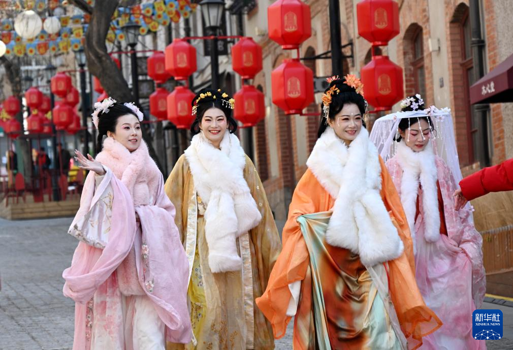 2月17日,几名身着传统服饰的女孩从青岛老城区街头走过。