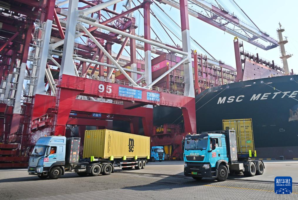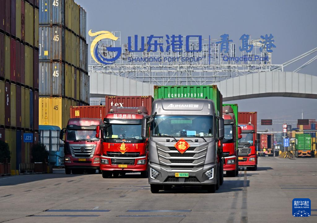 2月18日,卡车在青岛港前湾集装箱码头运送集装箱。