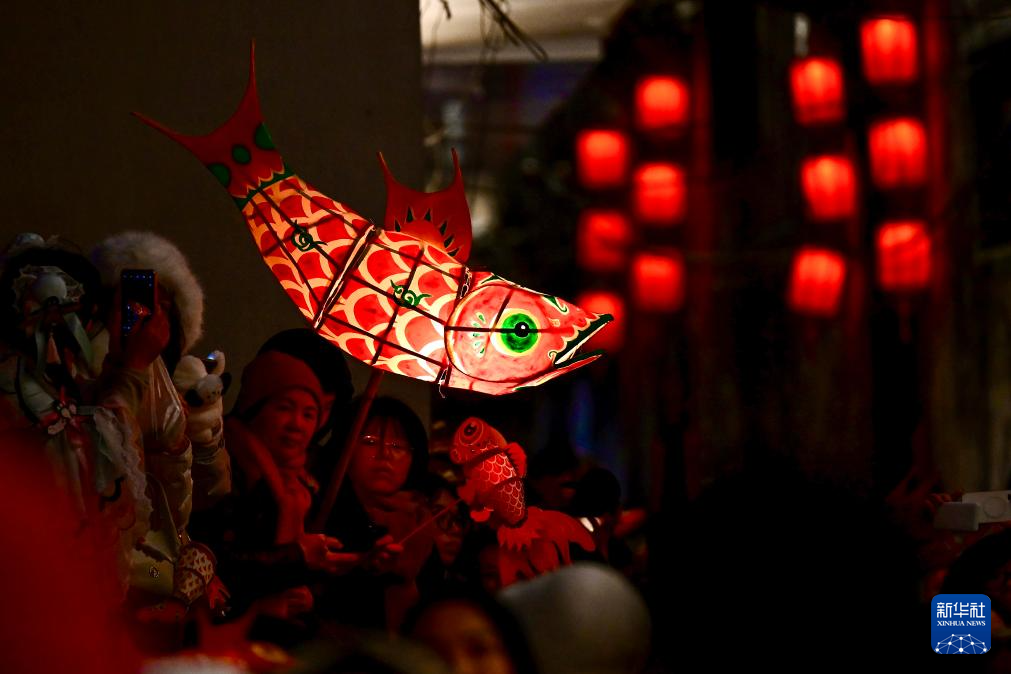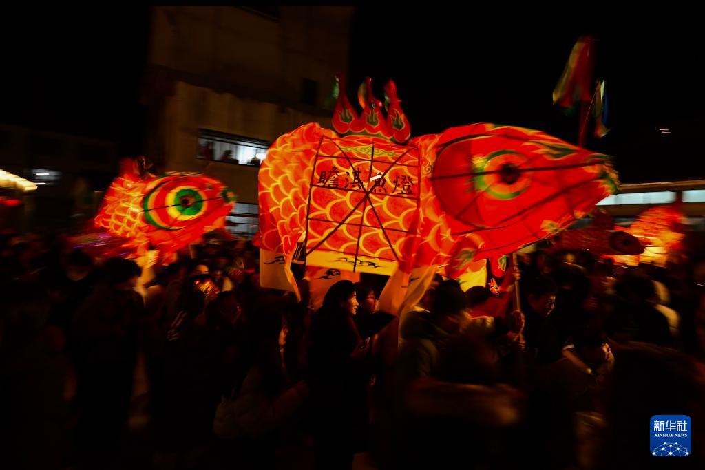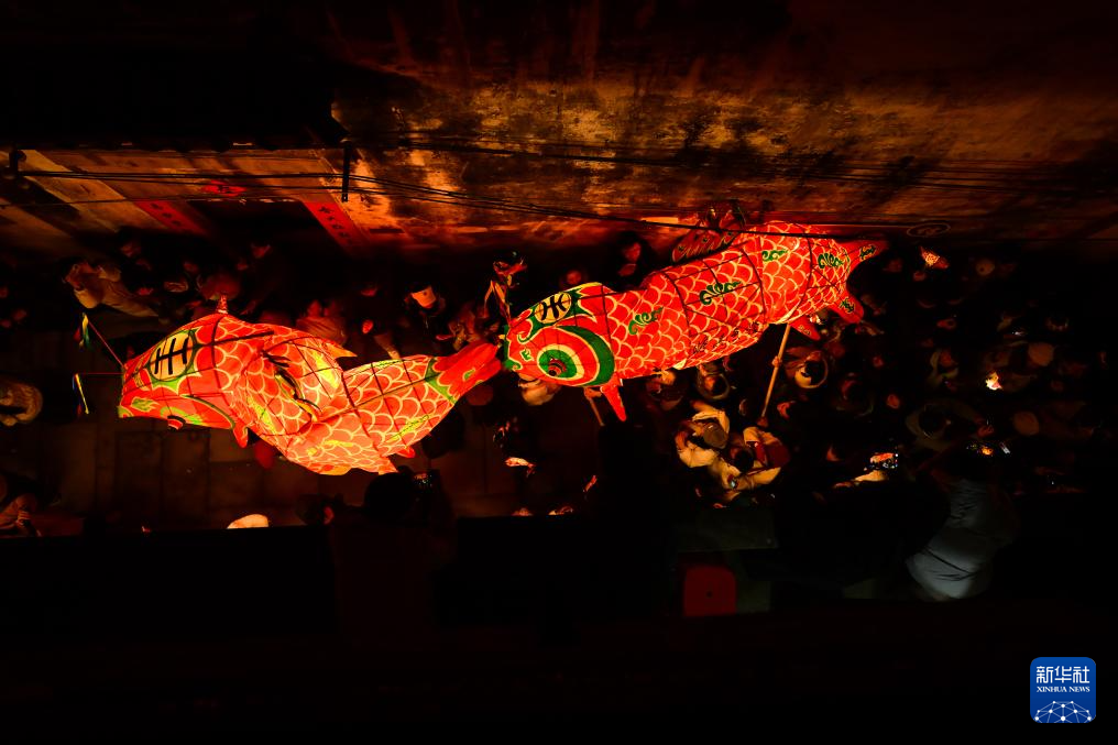 2月7日,瞻淇村鱼灯队在村中表演。