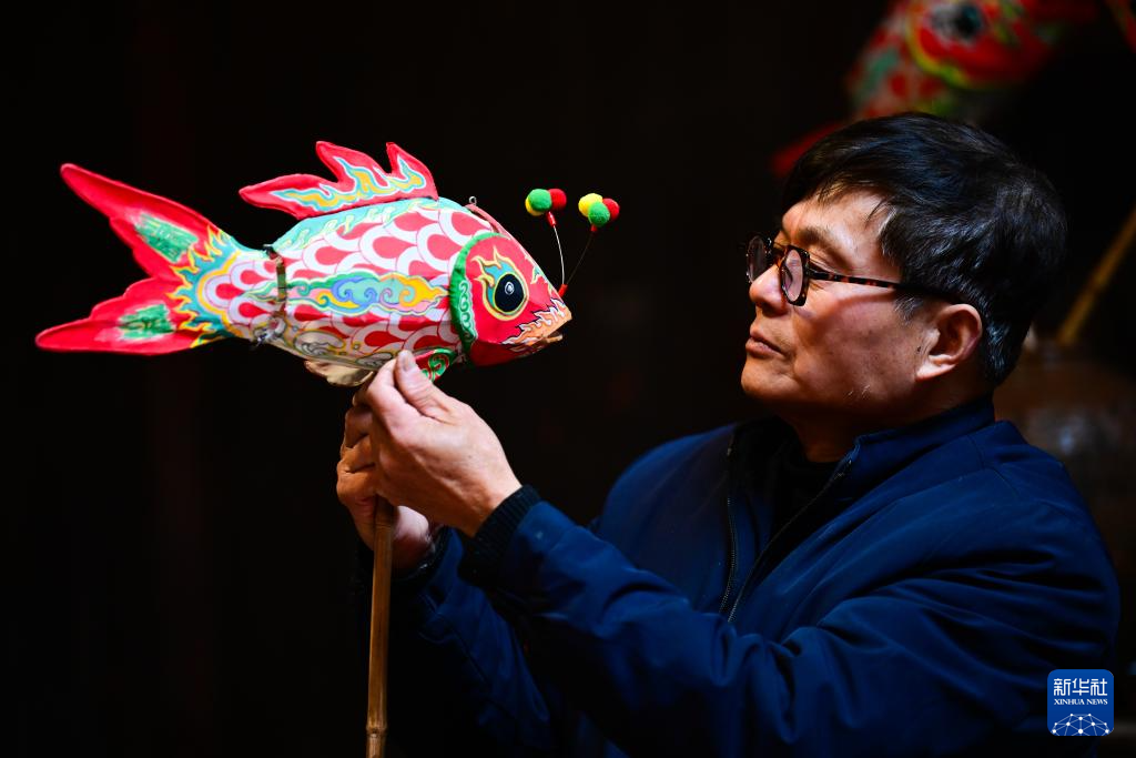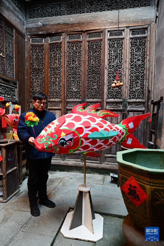 1月29日,瞻淇村的市级非遗项目鱼灯代表性传承人汪近午展示制作完成的鱼灯。
