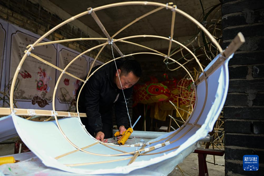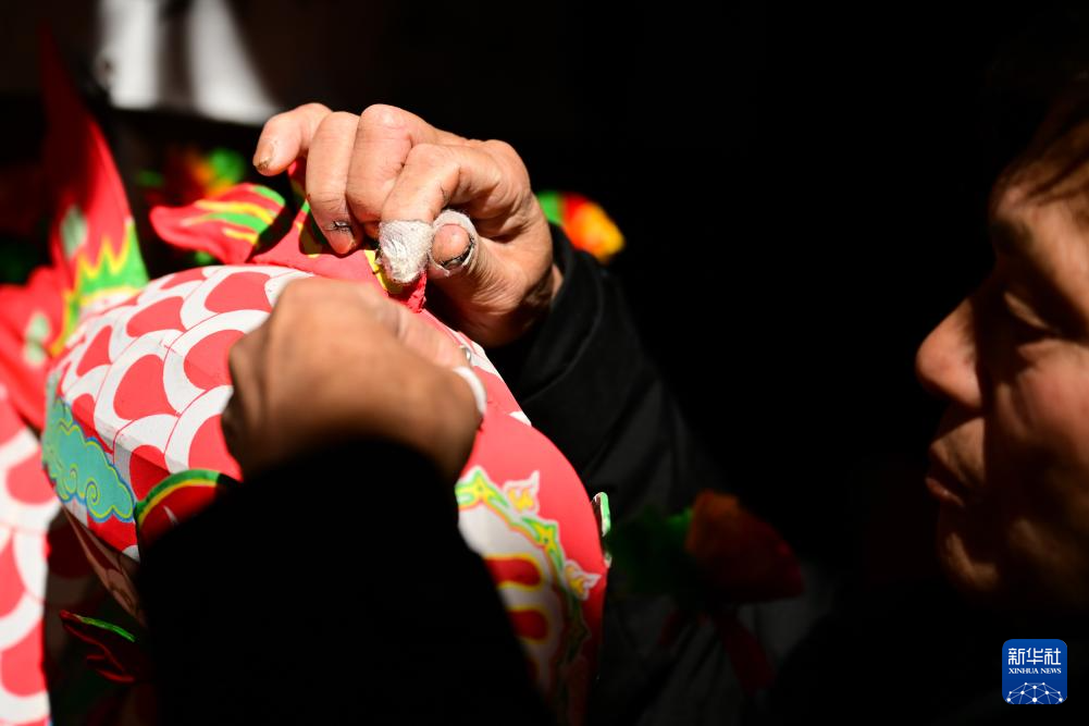1月29日,瞻淇村的县级非遗项目瞻淇鱼灯代表性传承人汪卓荤在制作鱼灯。