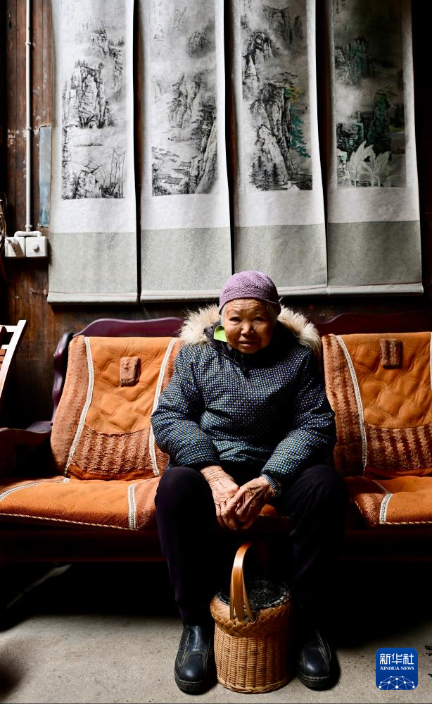 1月29日,在瞻淇村一幢古民居内,村民拿着火熜休息。火熜是徽州地区特色取暖工具。