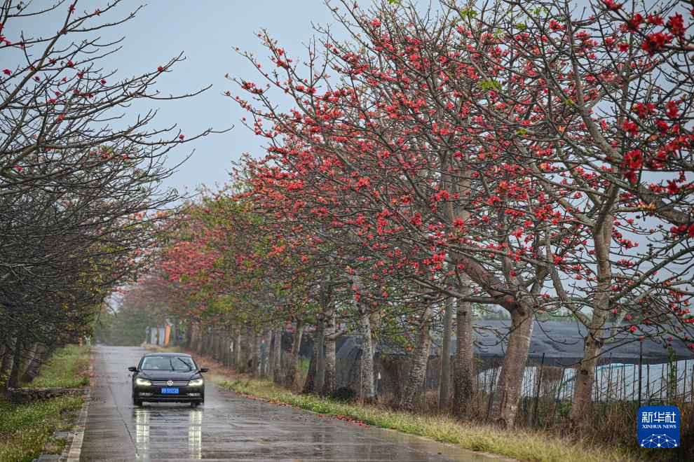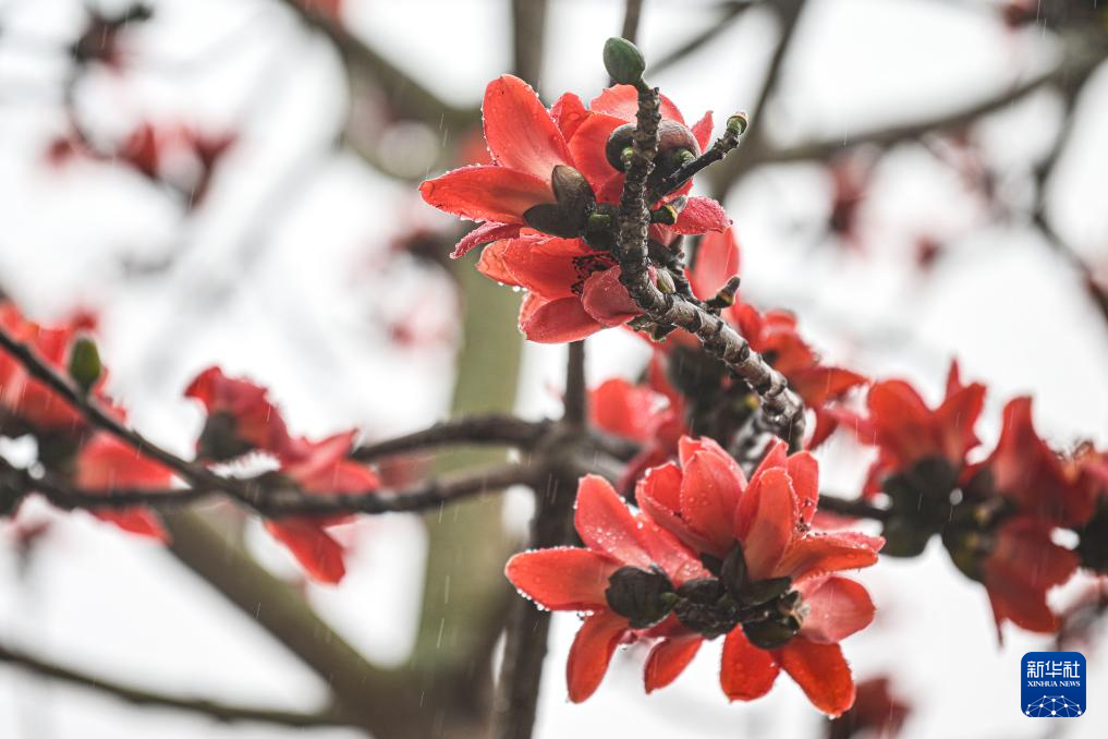 2月17日在海南昌江乌烈镇拍摄的在雨中绽放的木棉花。