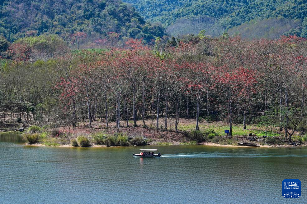 游客在海南昌江乘船游览昌化江,欣赏木棉花春色(2月15日摄)。
