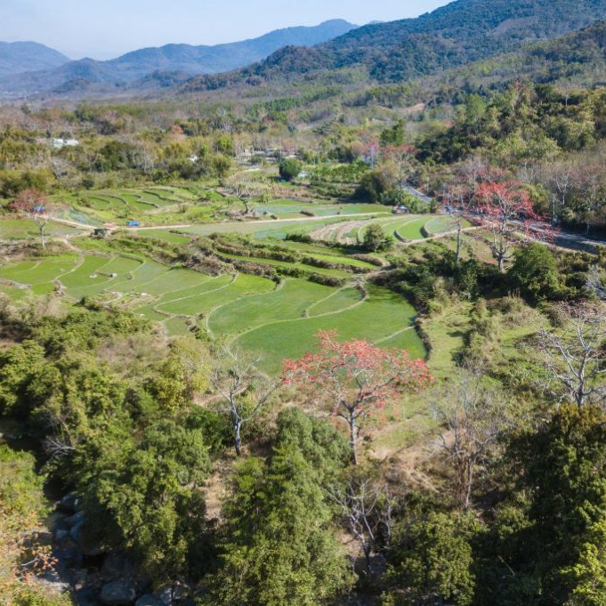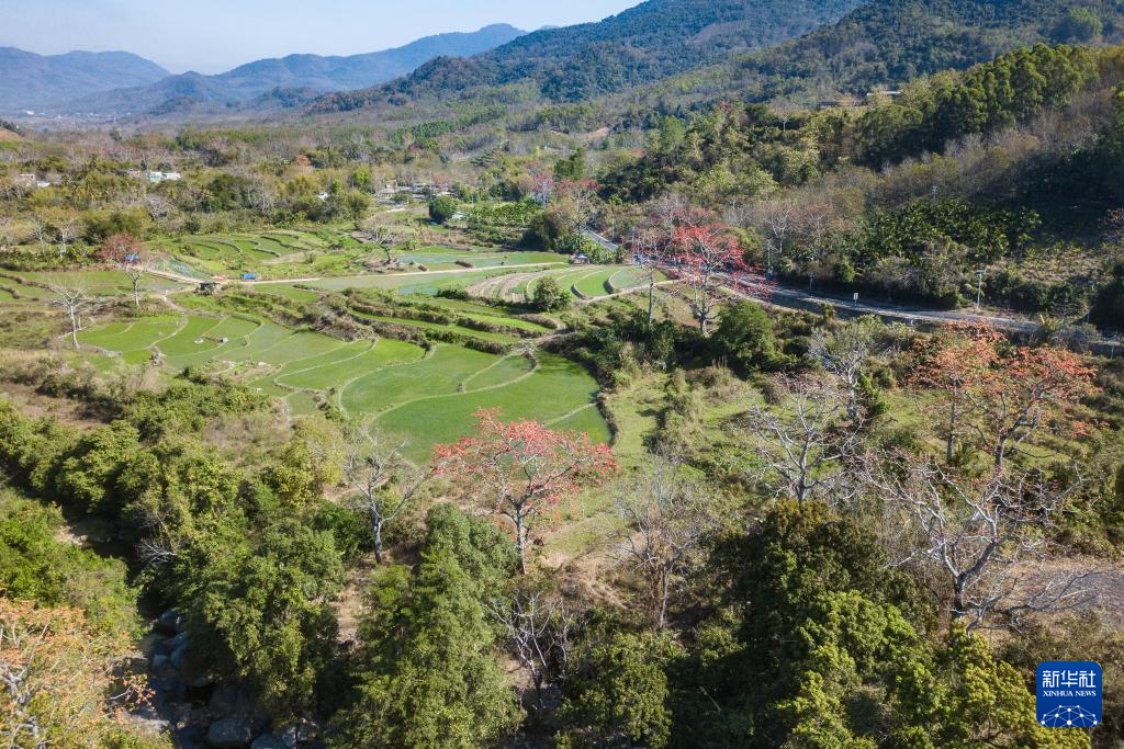 在海南昌江七叉镇拍摄的木棉花与梯田景色(2月16日摄,无人机照片)。