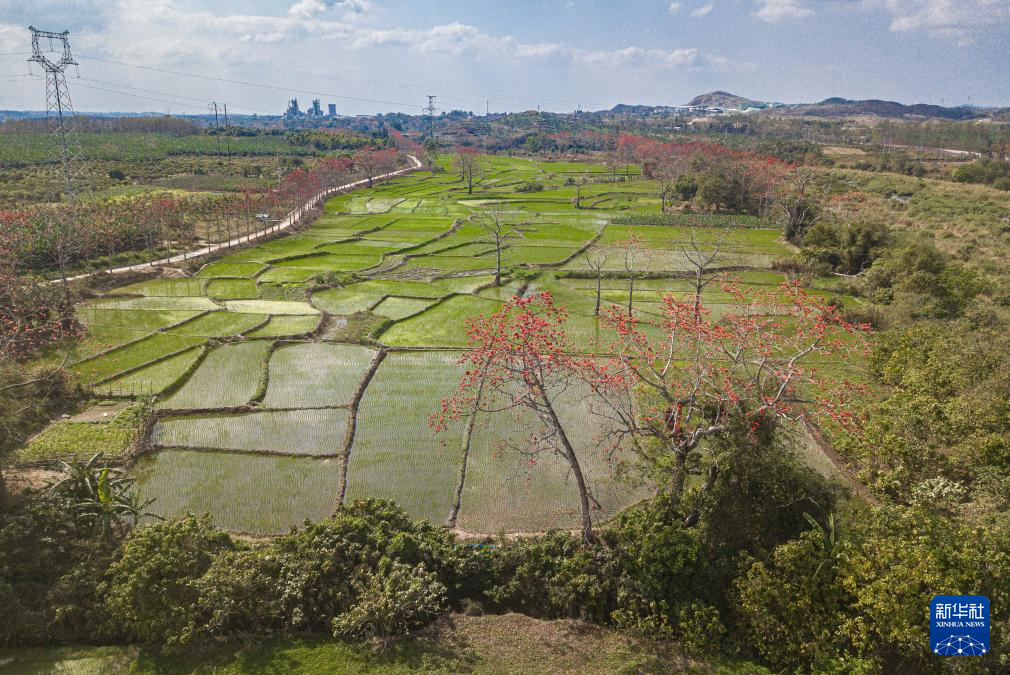 在海南昌江叉河镇拍摄的木棉花与稻田春色(2月14日摄,无人机照片)。