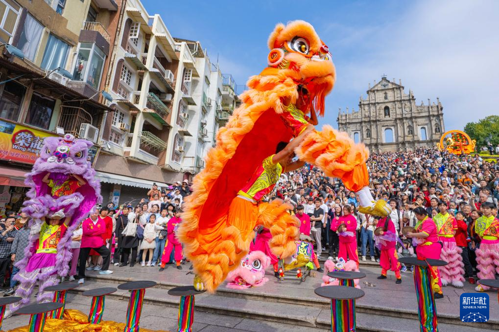 当日是大年初二,澳门旅游局在大三巴牌坊前组织舞龙舞狮等贺岁活动,吸引大批市民及游客驻足观赏。