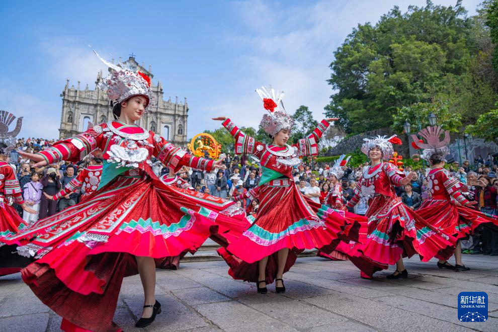 2月18日,贵州表演队在澳门大三巴牌坊前表演舞蹈。
