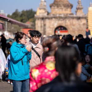 2月18日,小朋友们在昆明市官渡古镇品尝美食。