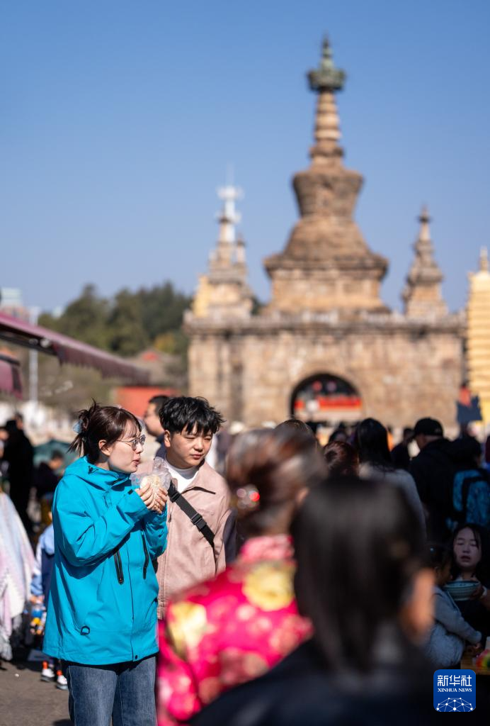 2月18日,游客在昆明市官渡古镇品尝官渡粑粑。