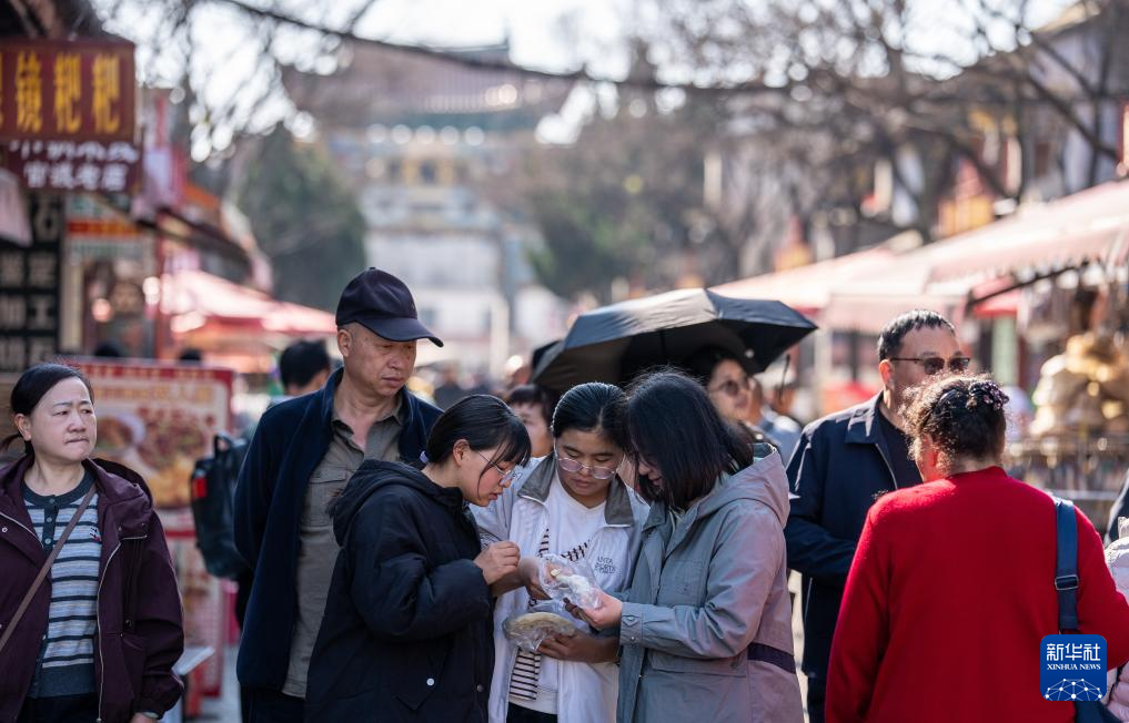 2月18日,在江苏省兴化市莲溪湖公园,市民和游客在特色小吃市集选购、品尝特色小吃。