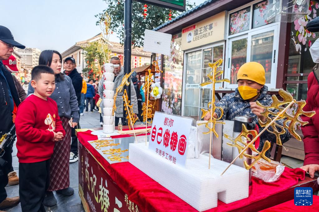 2月17日,游客(左)在湖南常德河街购买糖画。