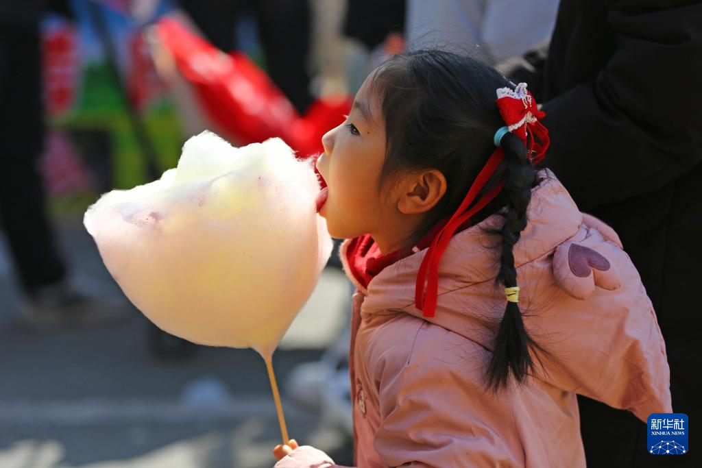2月17日,在山东省滕州市荆河公园,一名小朋友在品尝棉花糖。