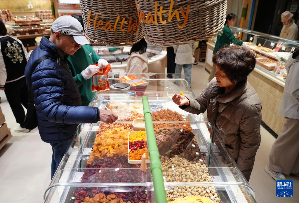 2月17日,游客在西安万象城一家食品店内选购果干。