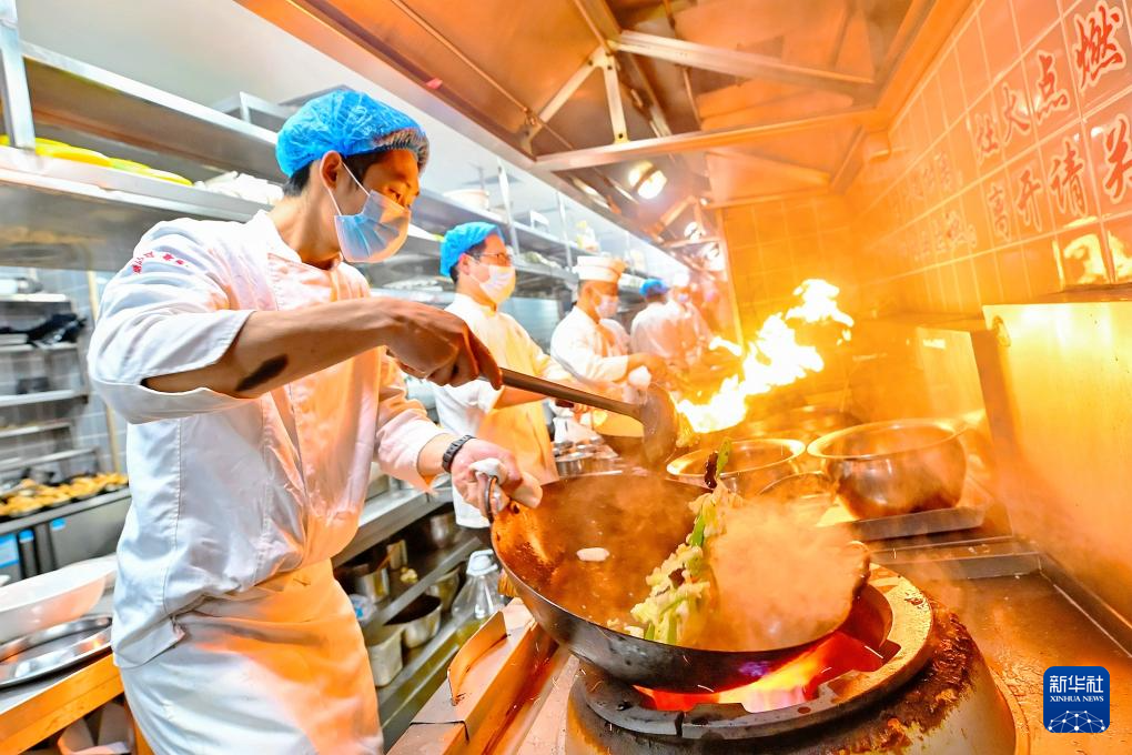 2月18日,在天津市滨海新区一家饭店内,厨师为顾客制作团聚宴菜品。