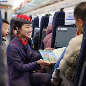 2月18日,在西安北开往武威东D2719次高铁列车的静音车厢,列车长用绘本贴图册引导小旅客安静乘车。