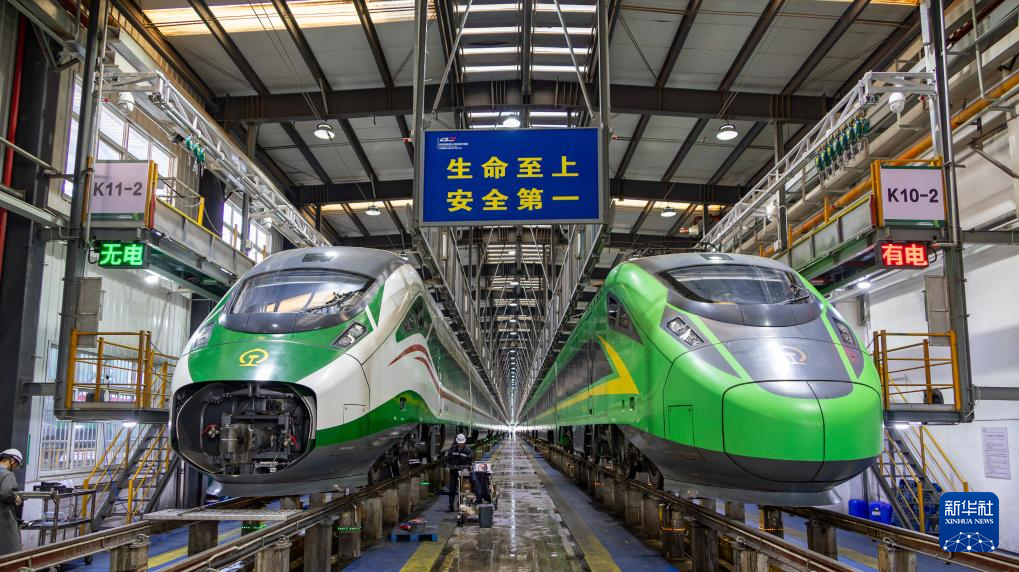 这是2月18日在中国铁路昆明局集团有限公司昆明车辆段昆西运用车间检修库内拍摄的正在等待检查的“复兴号”动车组。