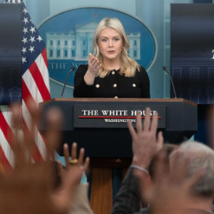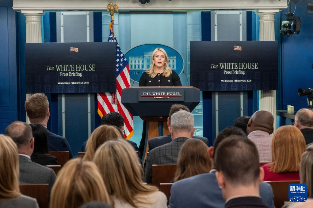 2月18日,在美国首都华盛顿,白宫新闻秘书莱维特出席记者会。