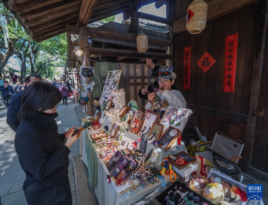 2月20日,游客在濮院时尚古镇的市集上选购特色文创产品。