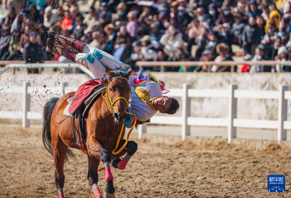 2月20日,马术队员在表演马上拾哈达。