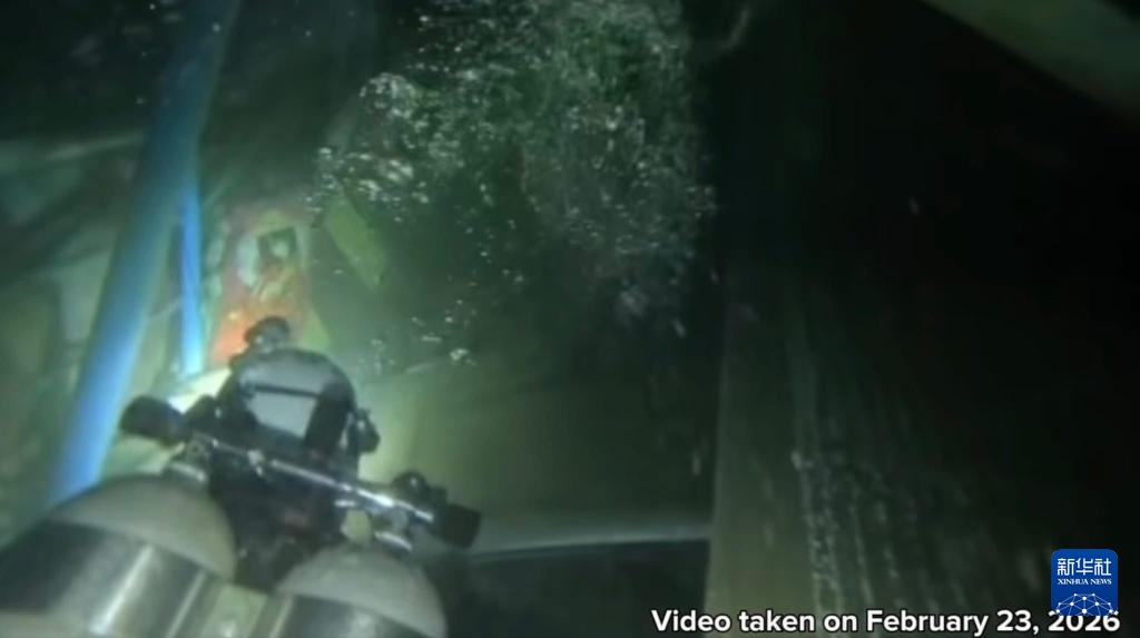 2月23日,在菲律宾巴西兰岛附近海域,菲律宾海警技术潜水员进行水下作业(视频截图)。