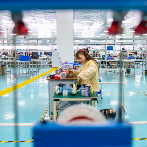 2月24日,在湖南省永州市道县高新技术产业开发区,工人在适配器生产企业流水线上工作。