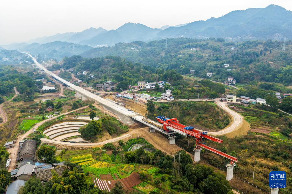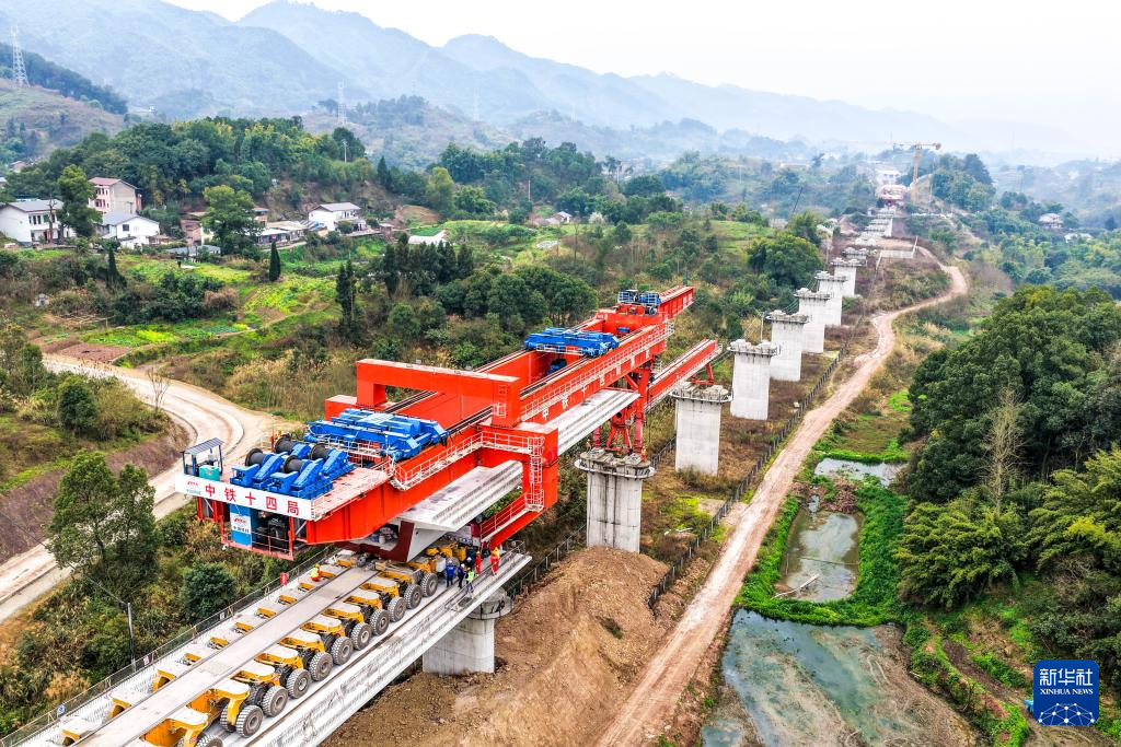 2月26日,在重庆市合川区清平镇的西渝高铁建设工地,架梁机在进行架梁作业(无人机照片)。