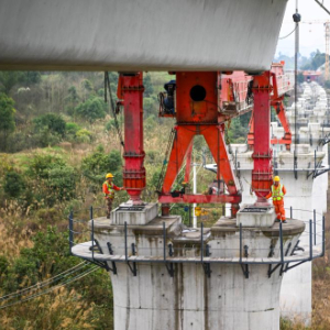 2月26日,在重庆市合川区清平镇的西渝高铁建设工地,工人在进行架梁作业。