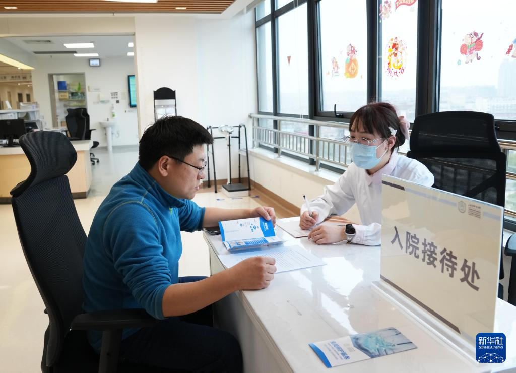 2月26日,在上海市肺科医院外科病区,护士为新入院患者的家属介绍免陪照护服务。