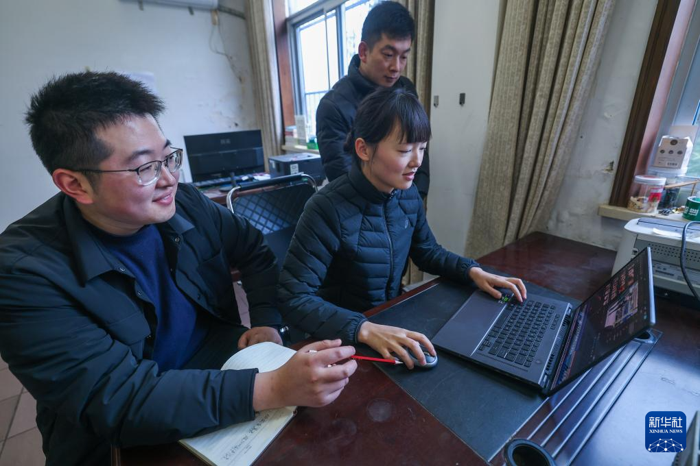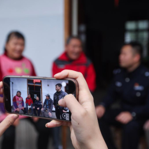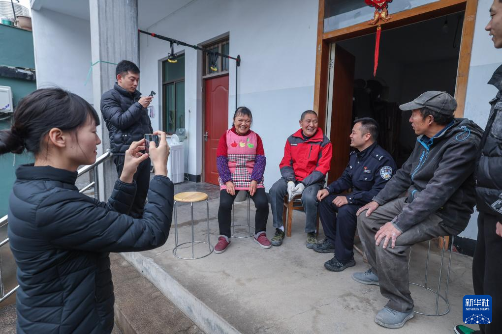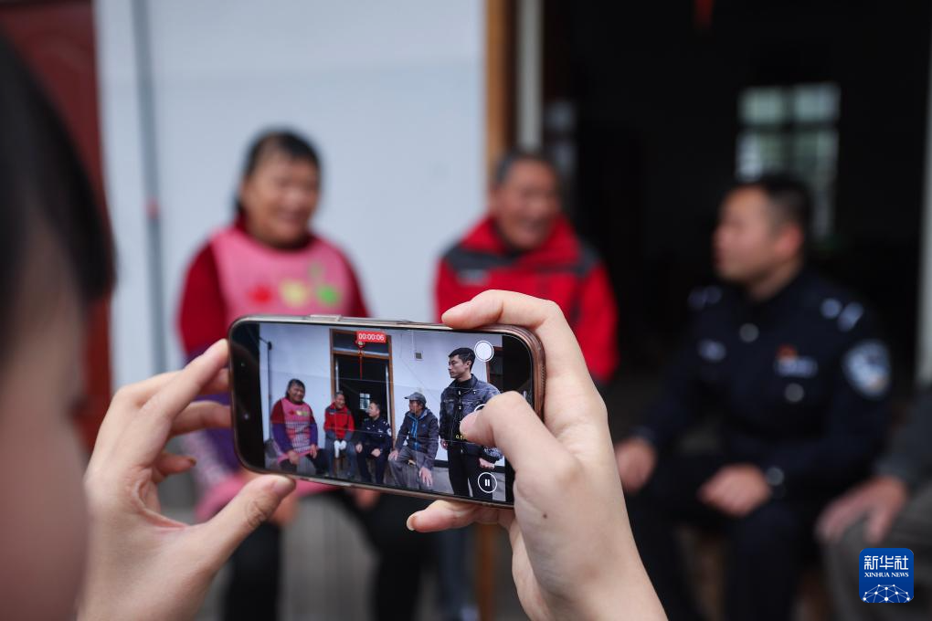 2月27日,赵家镇年轻基层干部(左一、左二)拍摄派出所民警和村干部入户走访百姓、调解纠纷的视频。