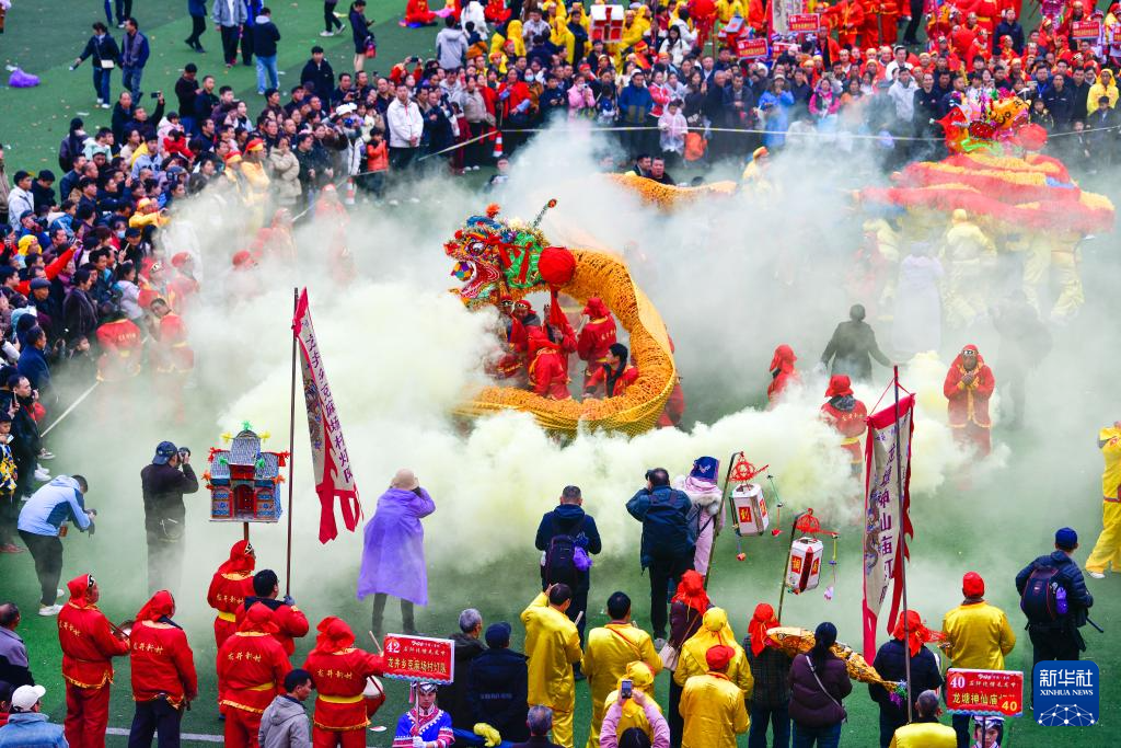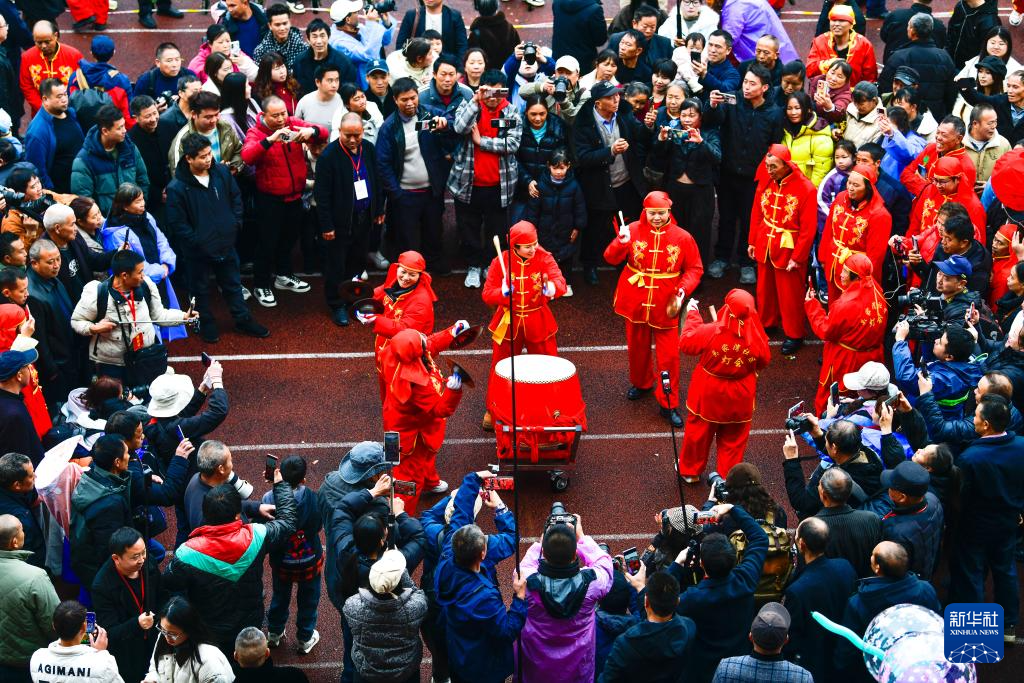 2月27日,人们在贵州省石阡县仡佬毛龙节上观看非遗展演。