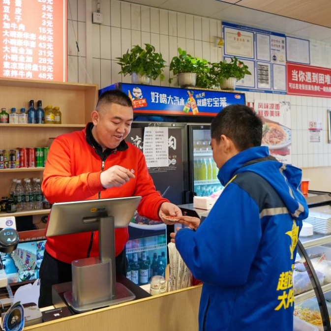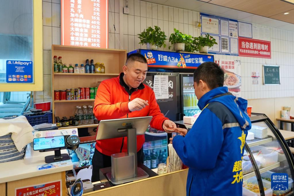 2月27日,在位于北京市朝外街道的老张拉面馆,成奶仓(左)为一位拿着“小红花”的快递小哥下单拉面。