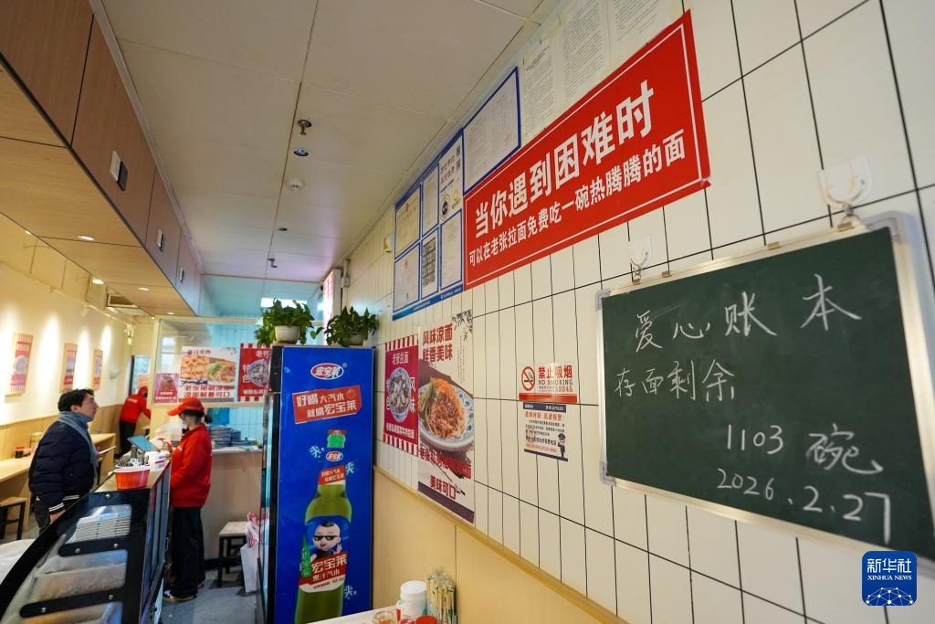 2月27日在北京市朝外街道拍摄的老张拉面馆店内一角。“爱心账本”上的“存面”来自当地企业和市民的公益捐赠。目前,面馆效益良好,已停止接受捐赠。成奶仓表示,以后将继续自行负担“爱心拉面”的支出。