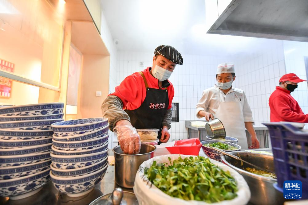 2月27日,在位于北京市朝外街道的老张拉面馆,厨师为顾客制作拉面。
