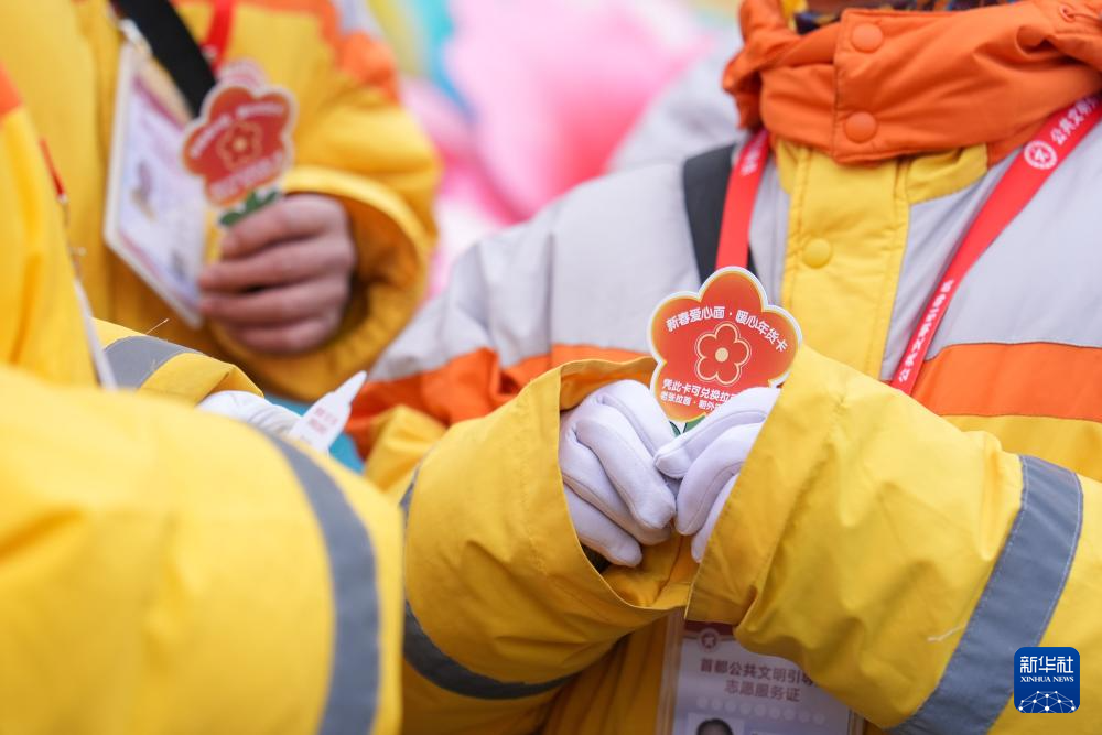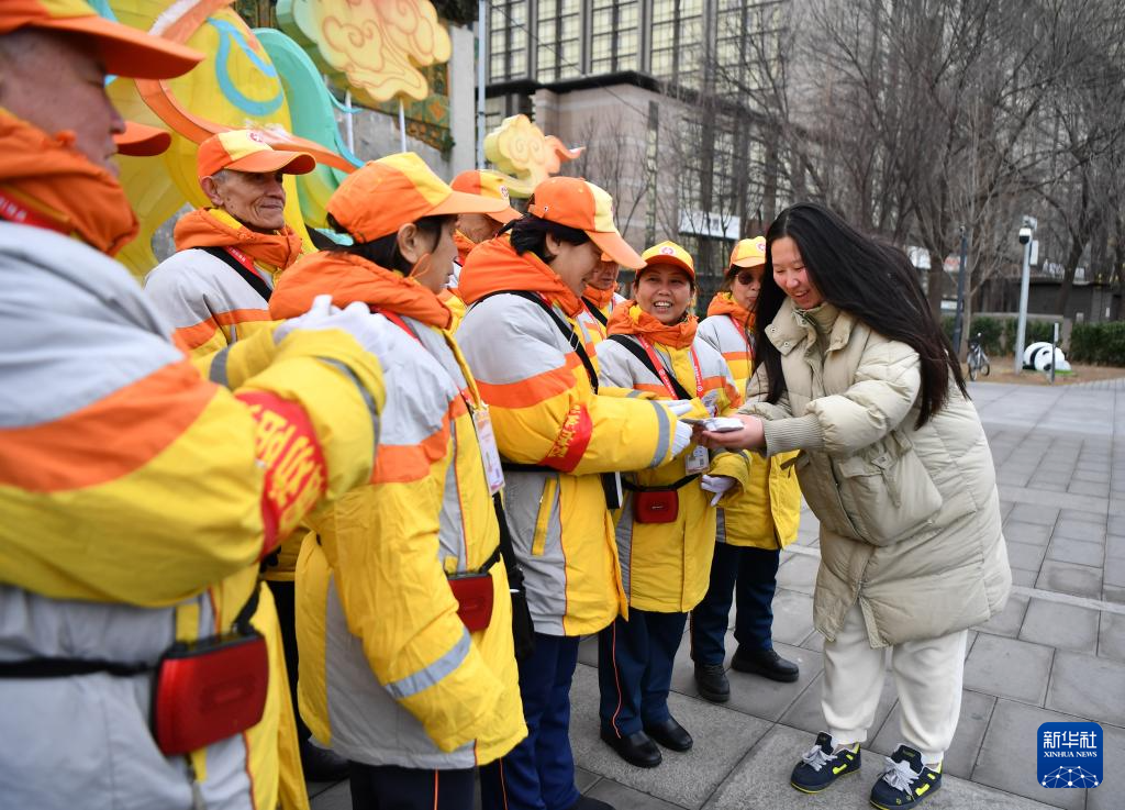 2月27日,在北京市朝外街道,公共文明引导员展示“老张拉面”温暖专送的牌子和“小红花”标识。