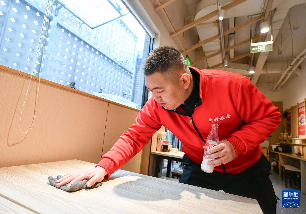 2月27日,在位于北京市朝外街道的老张拉面馆,成奶仓擦拭餐桌。