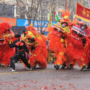 3月1日,社火队员在甘肃省定西市安定区内官营镇先锋村冒雪表演舞狮。