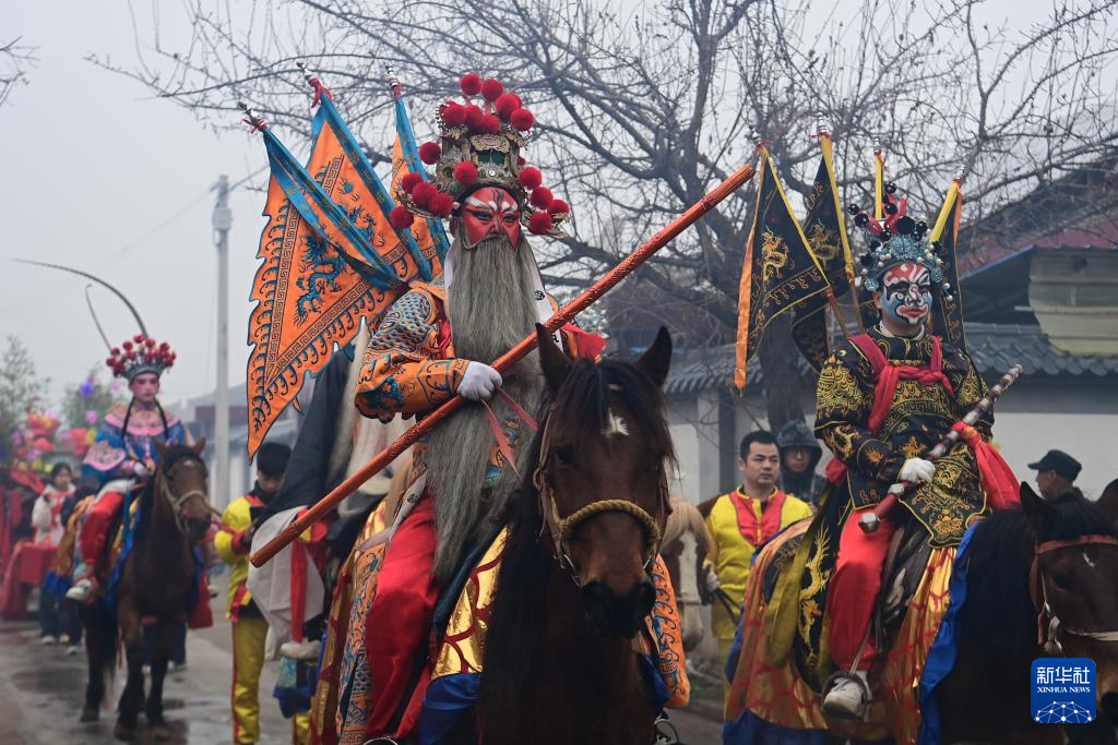3月2日,陇县黄花峪村村民在家门口迎接社火队。