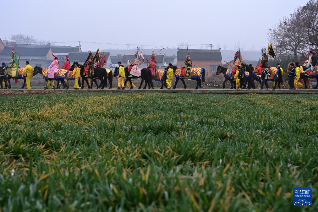3月2日,人们在路边跟随陇县黄花峪村社火队游演。