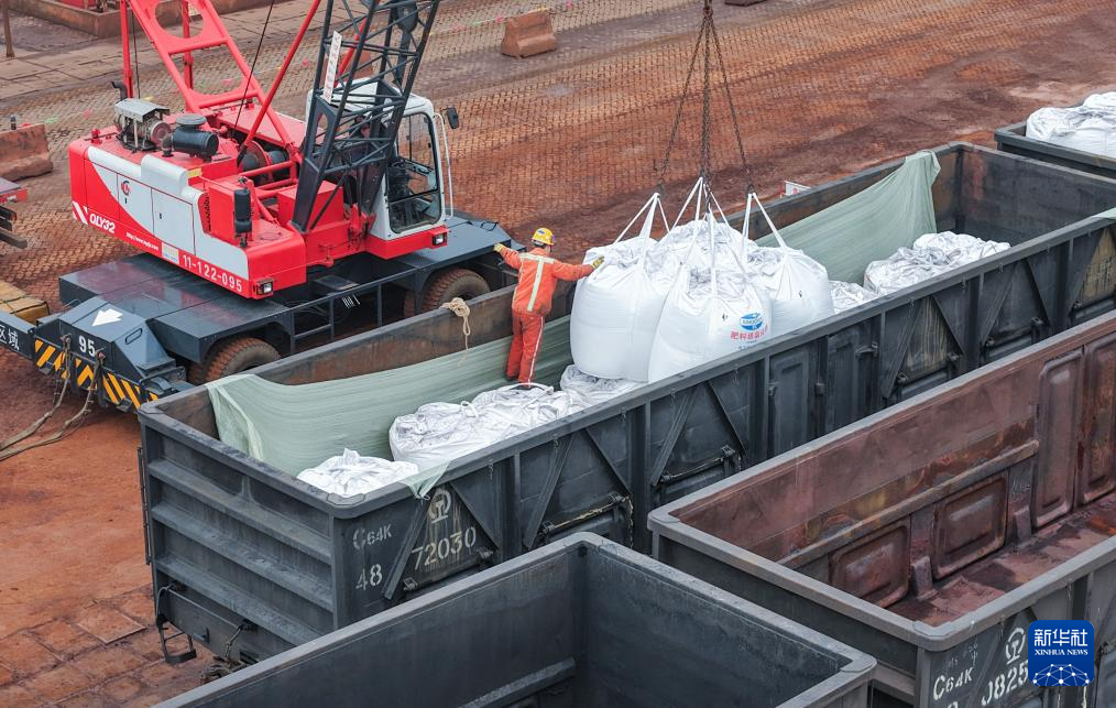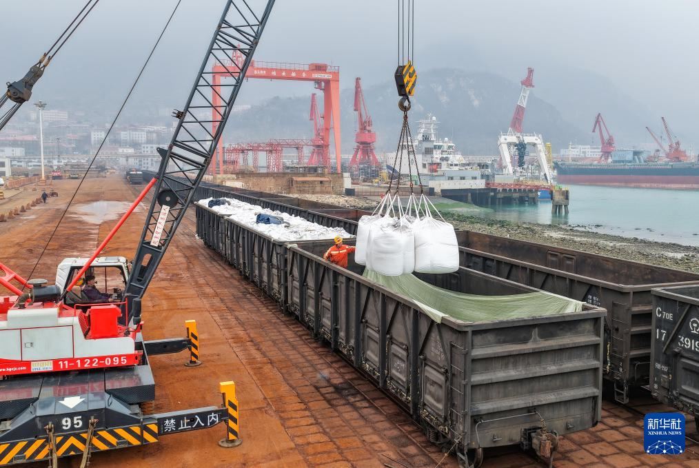 3月4日,工人在江苏连云港港东方港务分公司码头铁路装车点将化肥装上货运专列(无人机照片)。