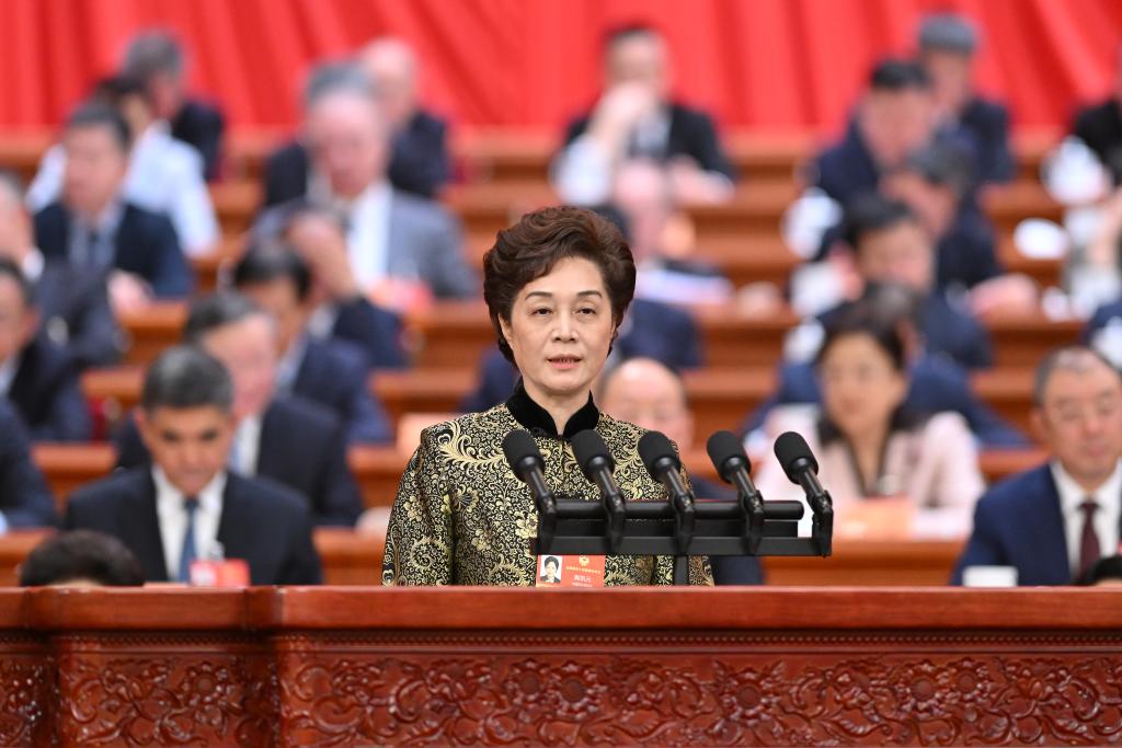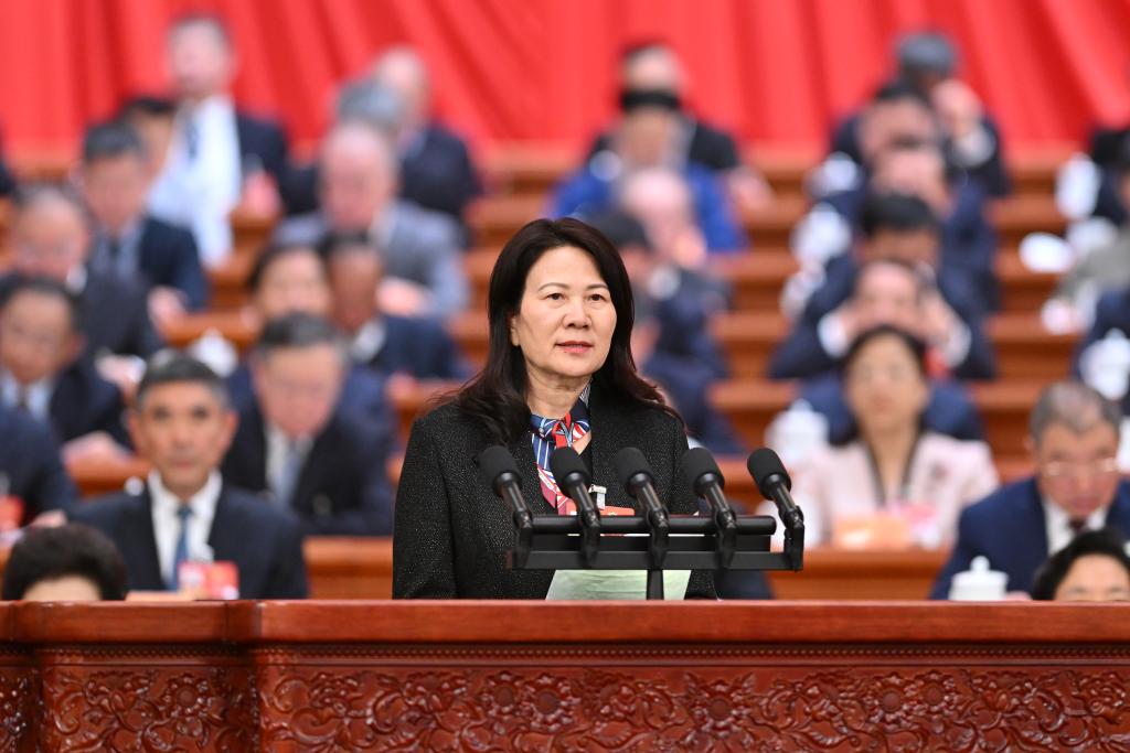 3月7日,全国政协十四届四次会议在北京人民大会堂举行第二次全体会议。这是江利平委员代表台盟中央作题为《实施“十五五”规划 高质量推进两岸融合发展示范区建设》的发言。