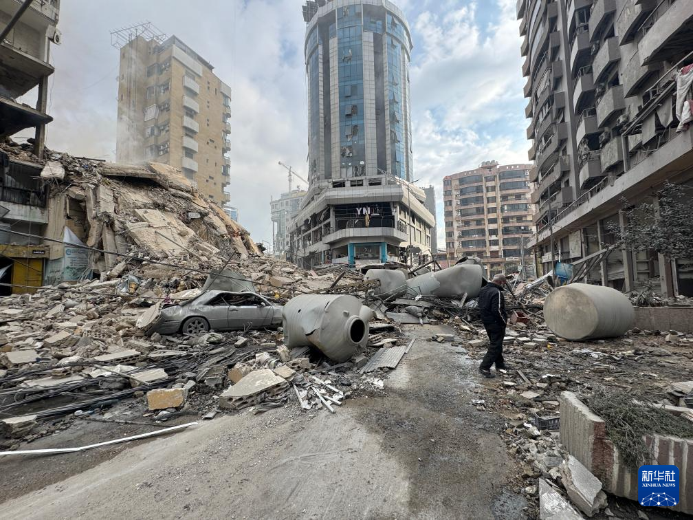 3月7日,在黎巴嫩首都贝鲁特南郊,一名男子行走在被以色列袭击摧毁的建筑废墟中。
