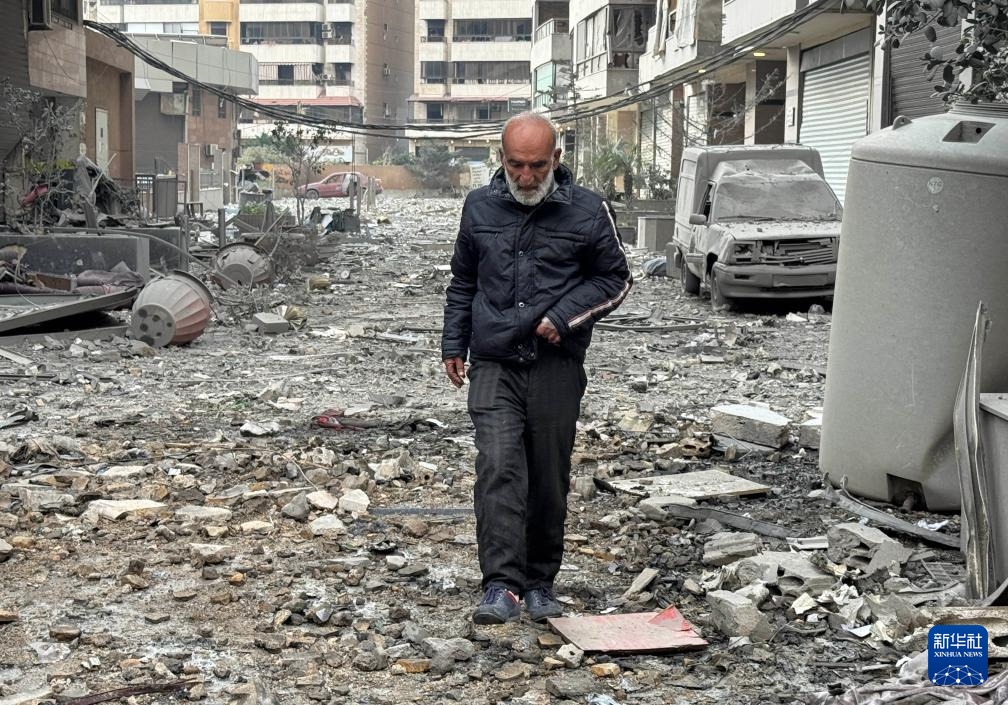 3月7日,在黎巴嫩首都贝鲁特南郊,一名男子行走在以色列袭击后的街道上。