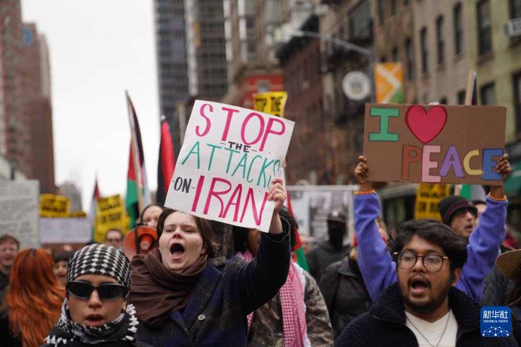 3月7日,人们在美国纽约参加集会游行,抗议美国和以色列对伊朗发动军事打击。
