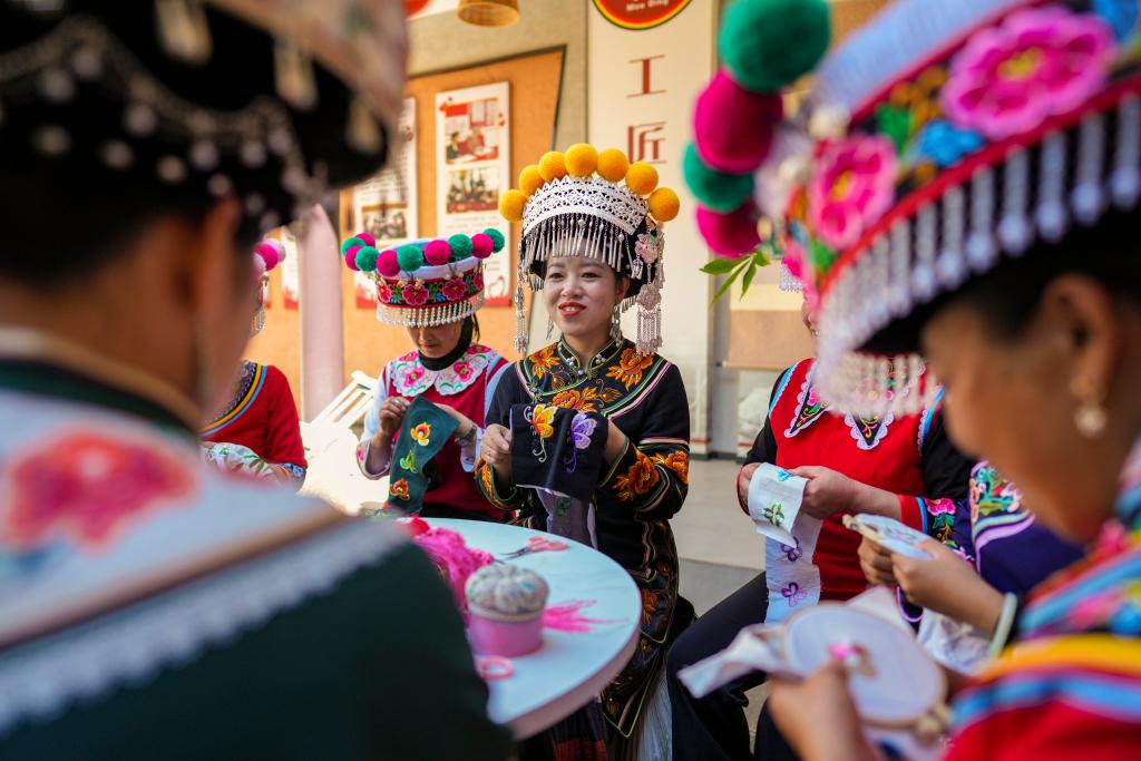 2月9日,在云南楚雄彝族自治州牟定县,全国人大代表金瑞瑞在自己的工作室内和绣娘们刺绣、谈心。